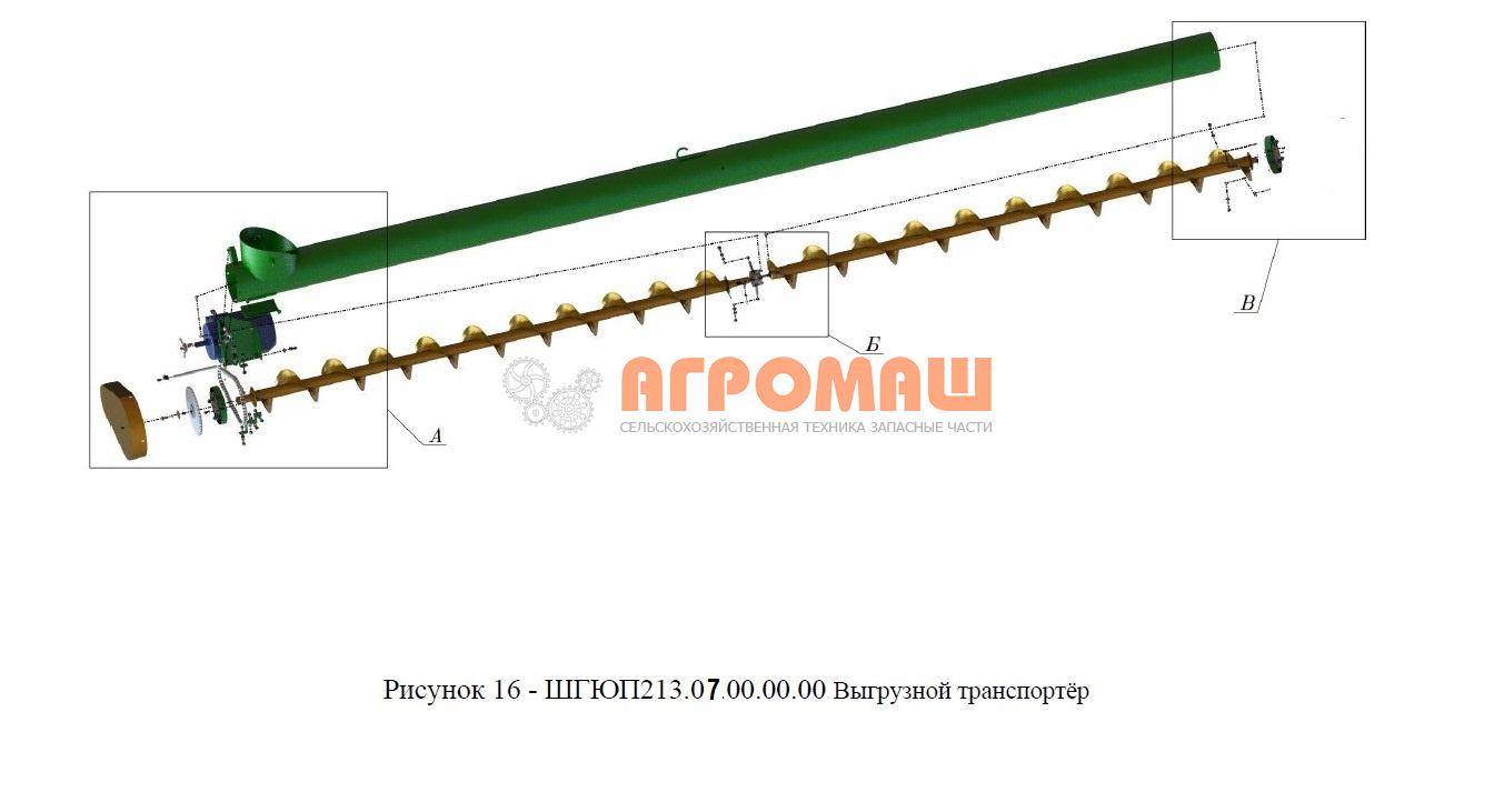ШГЮП213.07.00.00.00 — выгрузной транспортёр, в состав которого входят, в частности, корпус выгрузного шнека, первичный вал, электропривод, звёздочка, ограждение, фланец, кронштейн, натяжной винт, заслонка, ось, шпонка, болт, гайка, шайба, шплинт, винт, цепь и соединительное звено. Комплектующие для протравливателя семян ПСК-15.