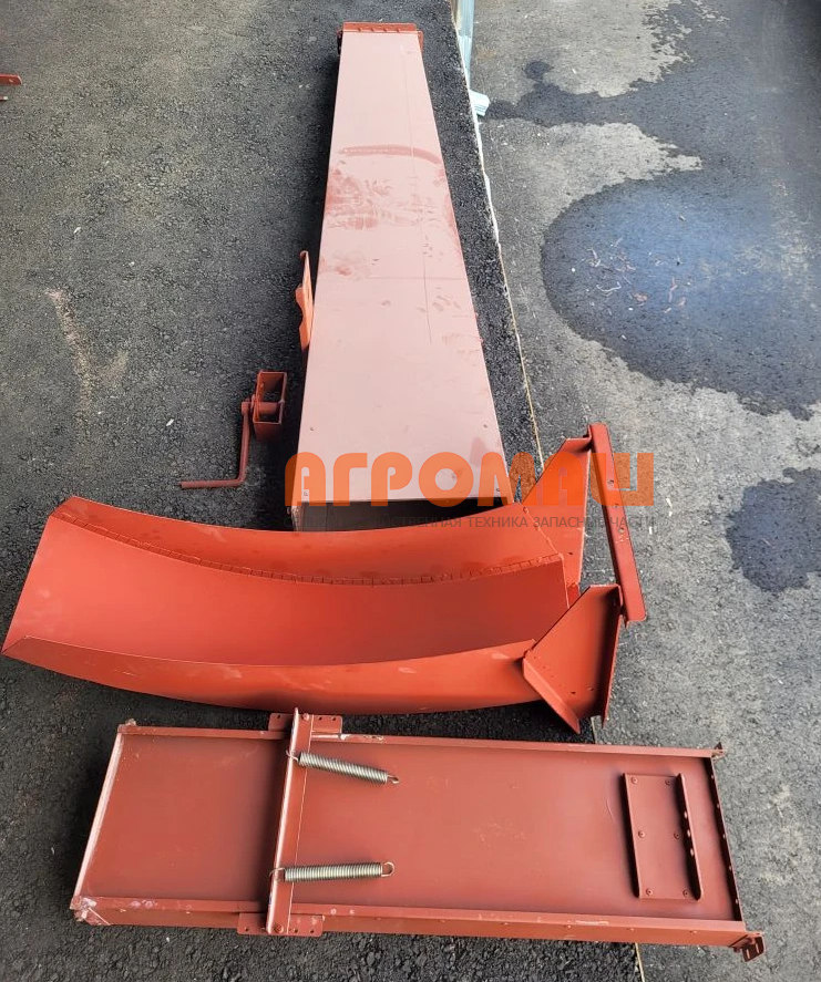 Лоток выгрузной А 100-07.04.00 — направляющая конструкция зернометателя А-100, обеспечивающая контролируемый сброс зерна в транспорт или бункер после обработки в выбрасывающем узле. Изготавливается из листовой стали Ст3 толщиной 3–4 мм, имеет сужающуюся форму и усиленные края для устойчивости к вибрации и механическим нагрузкам. Внутренняя поверхность выполнена без заусенцев и резких переходов, чтобы исключить налипание и замедление потока. Крепится к корпусу зернометателя болтами через фланцы, предусмотренные чертежом А 100-07.04.00. Угол наклона фиксированный (в отличие от моделей А-150/А-200), поэтому подбор положения транспорта должен учитывать эту особенность. Подлежит замене при коррозии, деформации днища или повреждении крепёжных узлов.